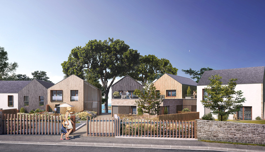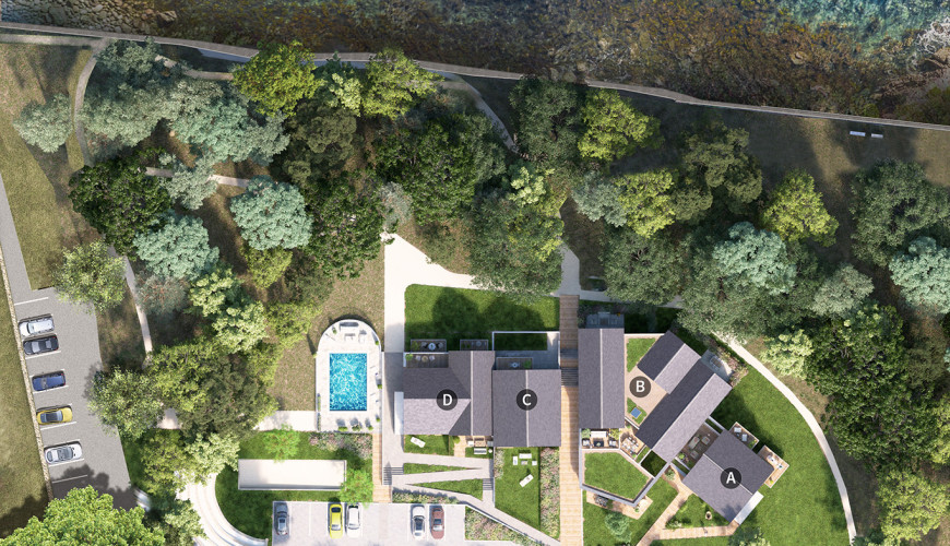 « Domaine Petra Alba » , ce sont 16 logements allant du T2 au T4, disposant tous d'une vue sur l'océan, inspirés des logements individuels scandinaves de bord de mer : bardage en bois naturel, bois brûlé, pierre de parement granit...